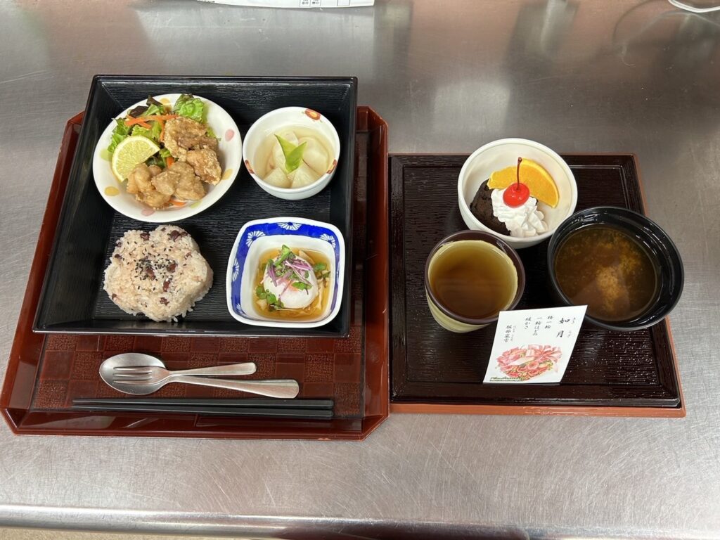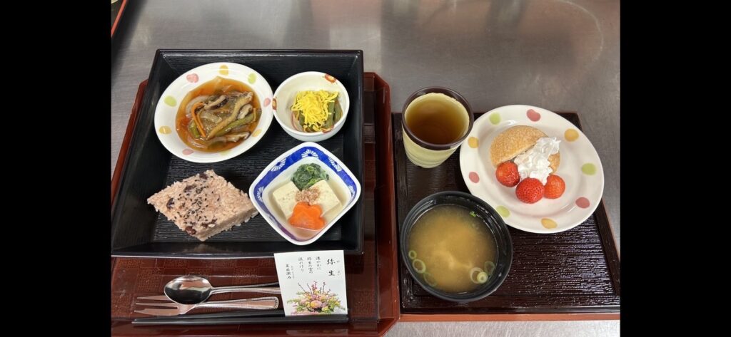 メニュー: 赤飯 ・ 松風焼き ・ マグロの刺身 ・すまし汁 ・デザート
