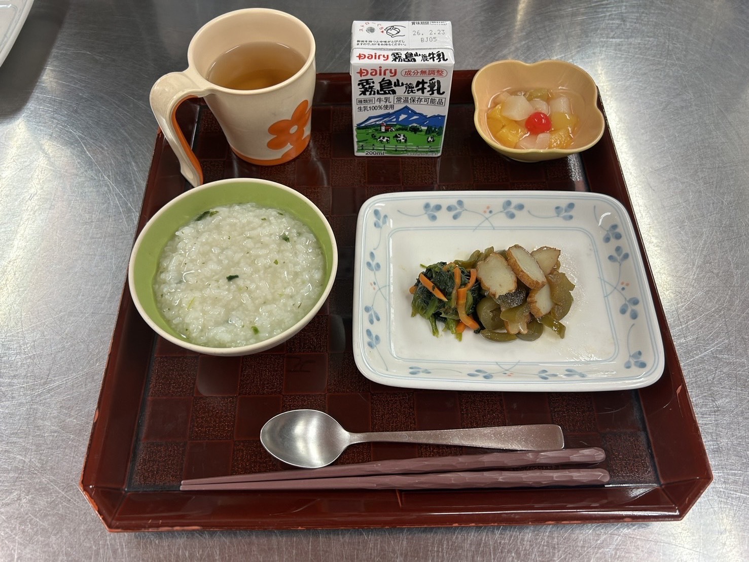 ・七草粥 ・平天炒め煮 ・ほうれん草の和え物 ・牛乳 ・フルーツ