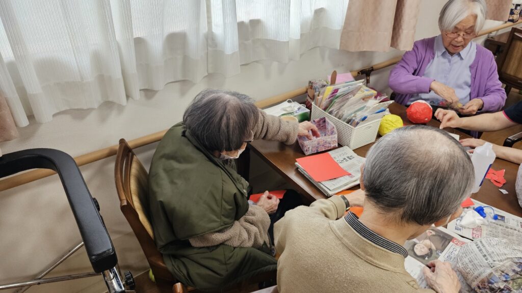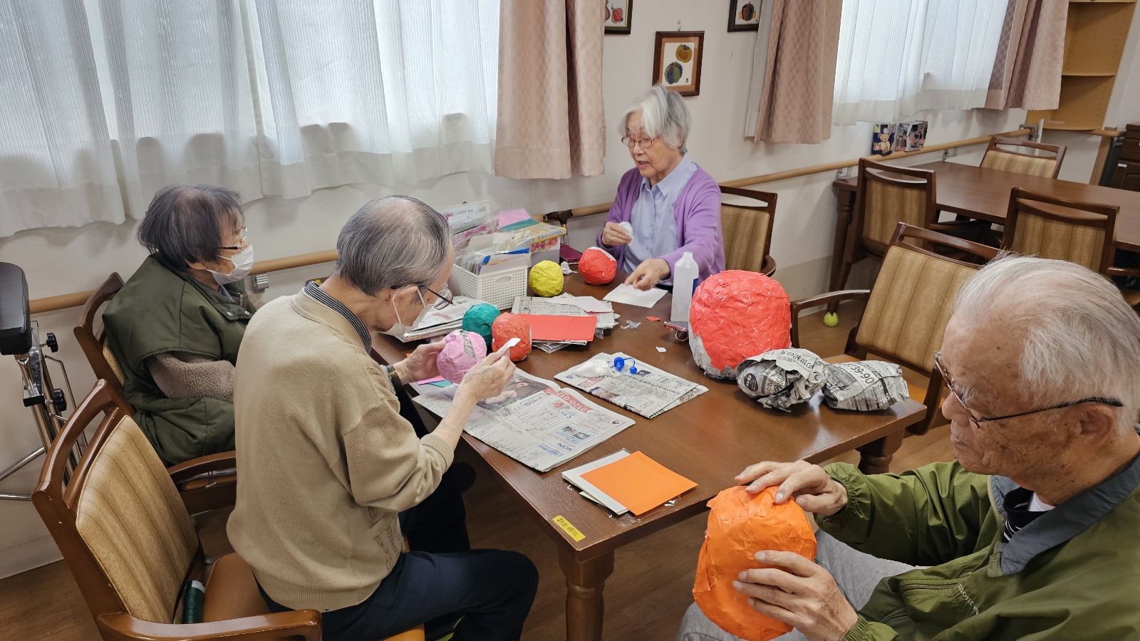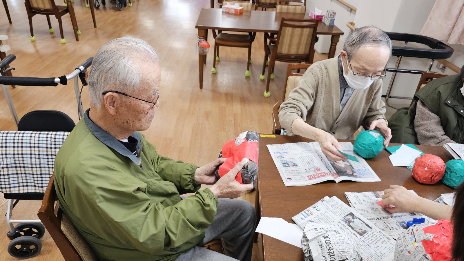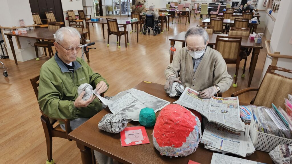 新聞をギュッギュッとまるめて、折り紙を貼り付けて
