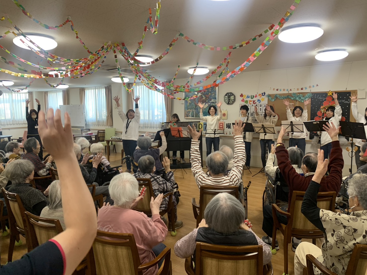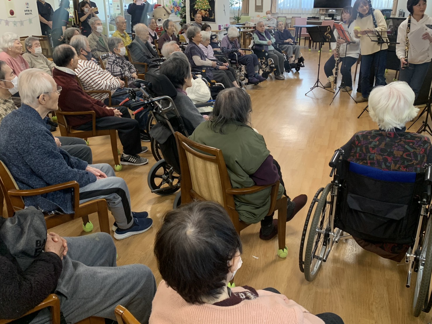 演奏会前にフロアに来てる入所者さん達も楽しそうに聴いていて