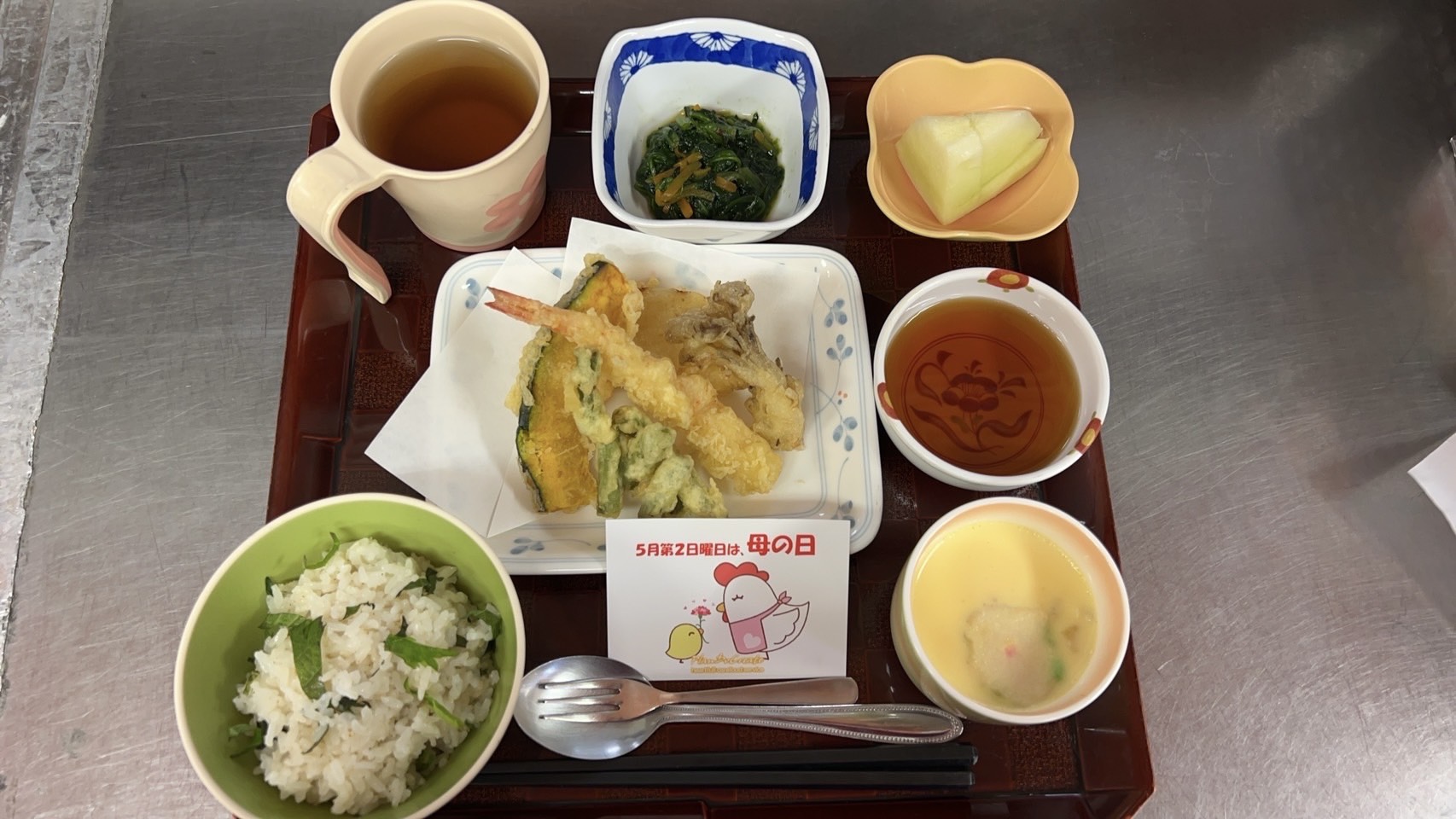 ・青じその混ぜ御飯 ・天ぷら盛り合わせ ・ほうれん草のお浸し ・茶碗蒸し ・フルーツ