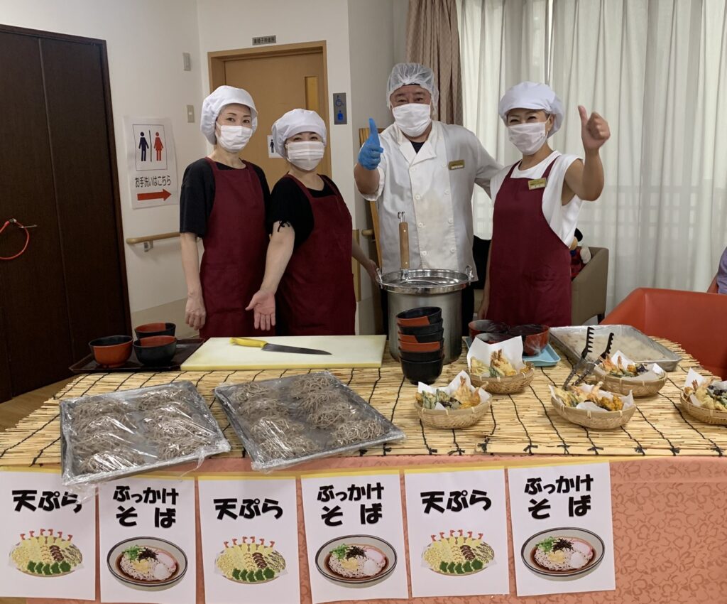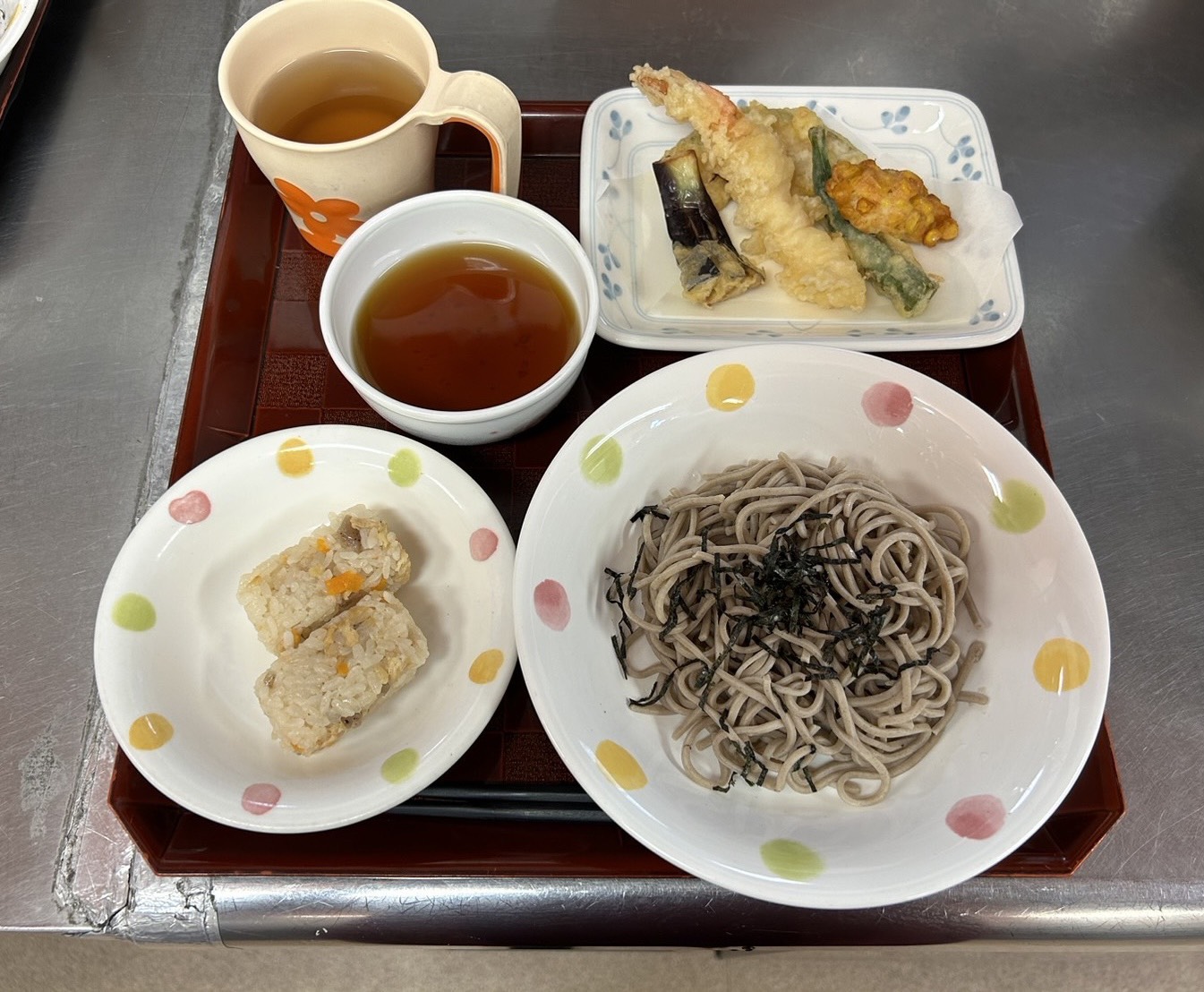 天ぷら(えび・なす・かぼちゃ・おくら・コーン)、ぶっかけそば、炊き込み御飯