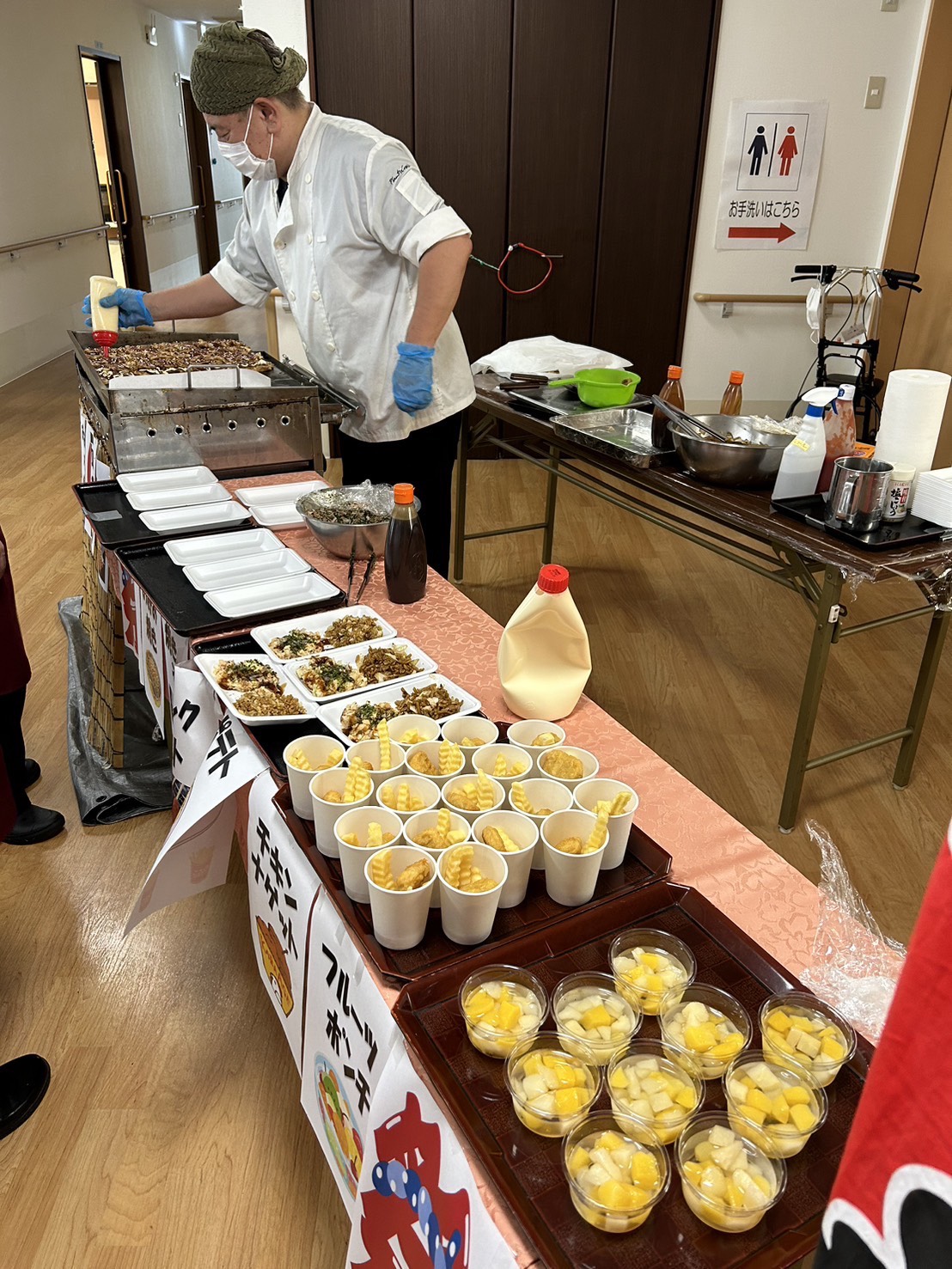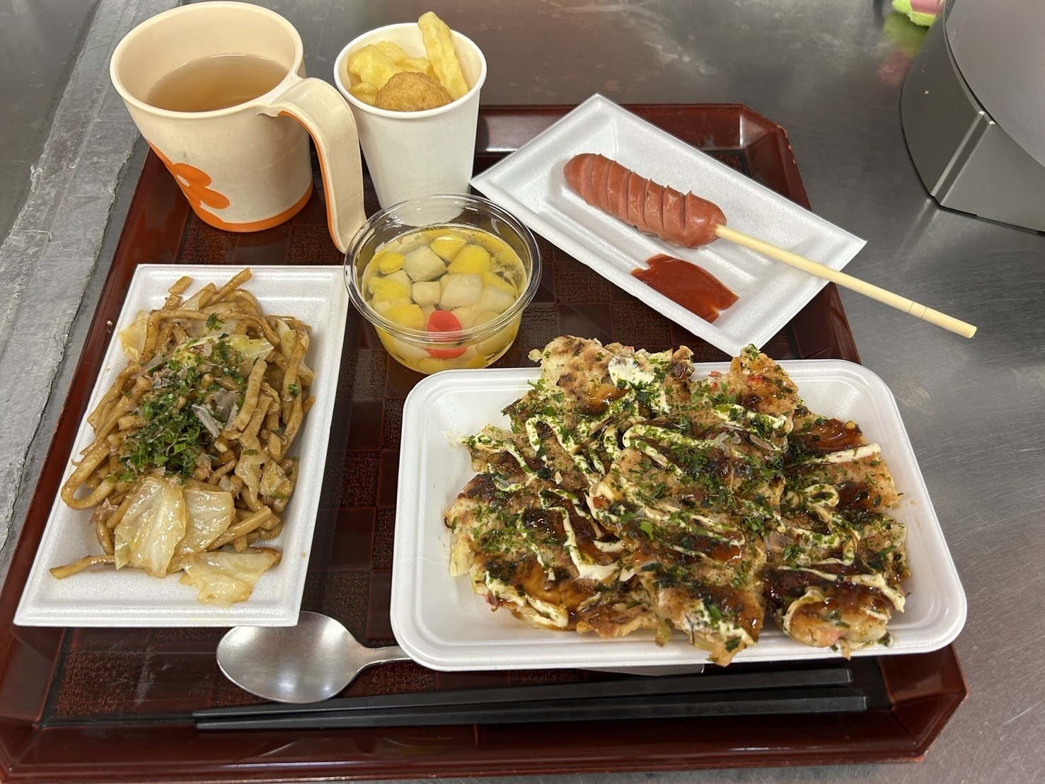 お好み焼、焼そば、フランクフルト、ポテトフライ、チキンナゲット、フルーツポンチ