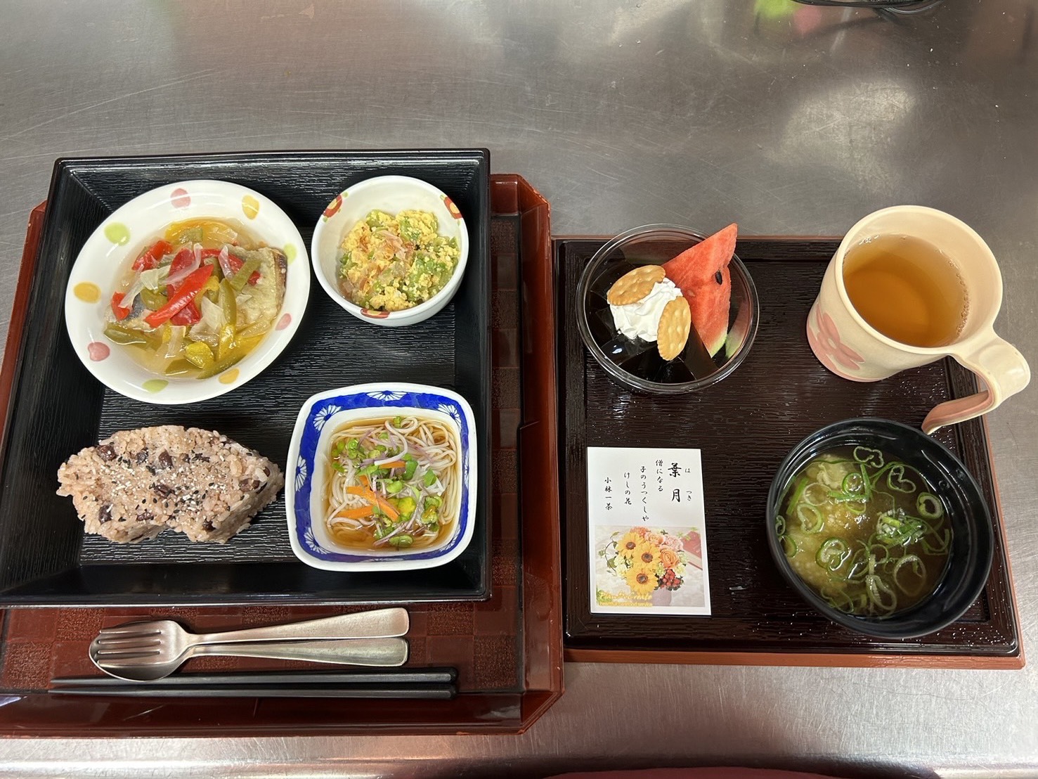 ・赤飯 ・鯵の彩り南蛮 ・ゴーヤの卵炒め ・焼きナスのすまし汁 ・デザート