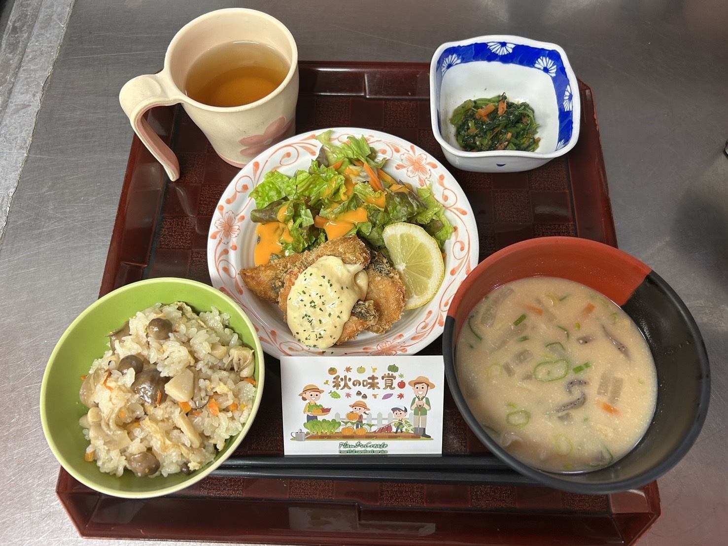 ・きのこがおいしい炊き込み御飯 ・鮭のフライ ・春菊の生姜和え ・粕汁