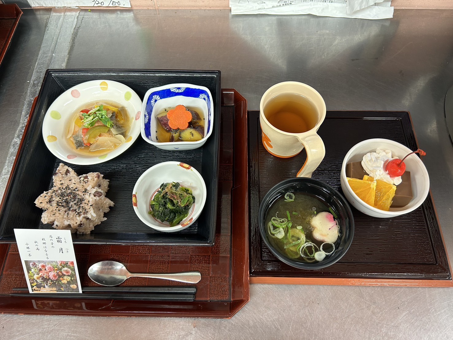 ・赤飯 ・鮭の南蛮漬け ・さつま芋の煮物 ・ほうれん草のおかか和え ・すまし汁 ・デザート